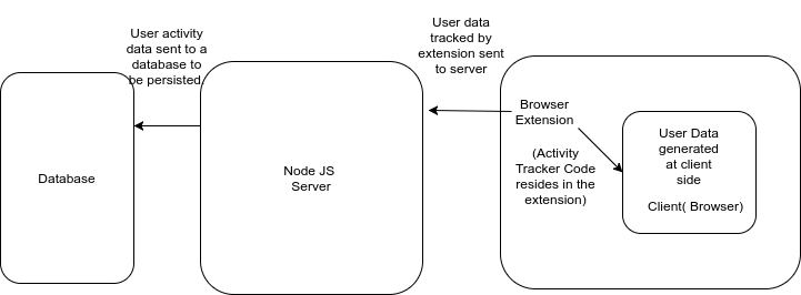 Our strategy is to intercept user events using a browser extension, retrieve the information from the event and send the data to our server, which in turn send the data to the database server for storage.