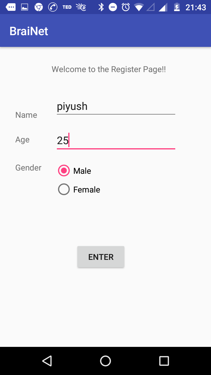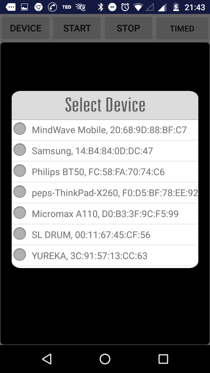 The data collection is done by connecting the Neurosky Mindwave device to the mobile application via Bluetooth. Once the subject wears the sensor, the connection is established between the mobile app and the sensor device, the data is streamed to the application. The data collected by the application from the sensor is in raw form. The period of time for which the data is collected can be set in two ways: