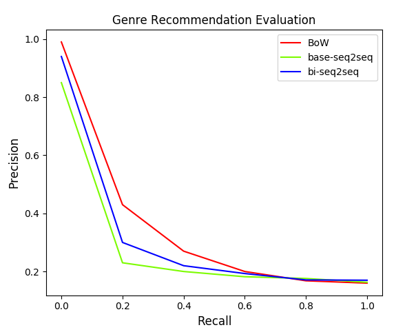 The Recommendation task, as shown in Figure below, captures some interesting insights about the effectiveness of different models for capturing different characteristics. Firstly, high precision values demonstrate the relevance of the playlist embedding space which is the first and foremost expectation from a recommendation system. Also, BoW models capture genre information better than seq2seq models, while length information is better captured by the seq2seq models, demonstrating the suitability of different models for different tasks.