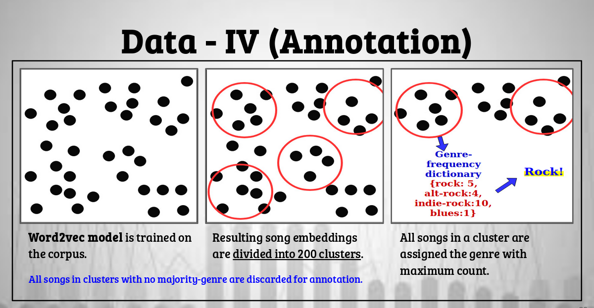 • All the songs in a cluster with no clear genre majority are discarded for annotation.