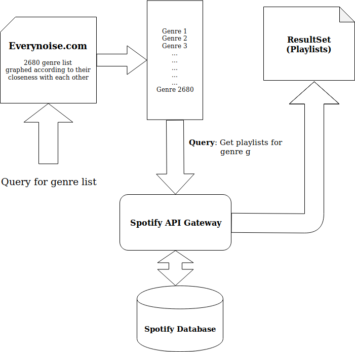 We download the data using the Spotify Web API. To collect a big enough set of terms to query the Spotify system, we use everynoise.com. This interactive website contains a list of some 2600+ genres, graphed out according to their relationship with each other, along with an audio example for each genre. We parse the data from the home page of this website and get the list of all the genres. Then for each genre, we download playlists (along with the corresponding song information) using the Spotify Web API. The whole flow is shown in Fig 1.