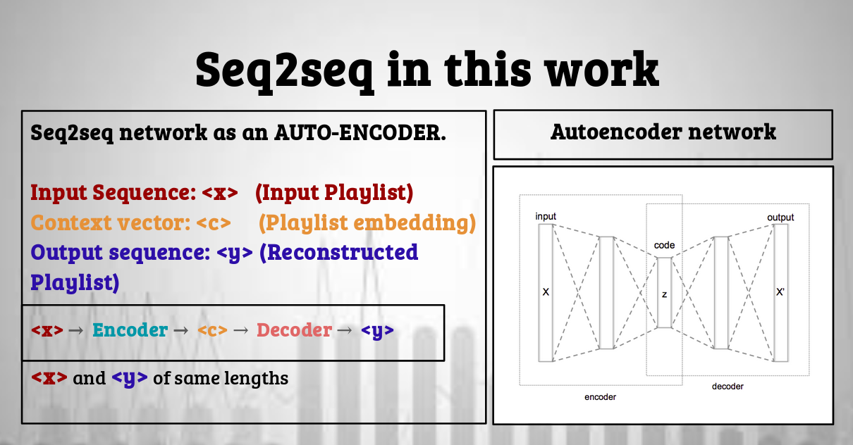 For this work, we use seq2seq framework as an autoencoder where the task of the network is to reconstruct the input playlist and in doing so, learn a compact representation of the input playlist, which captures the properties of the playlist.