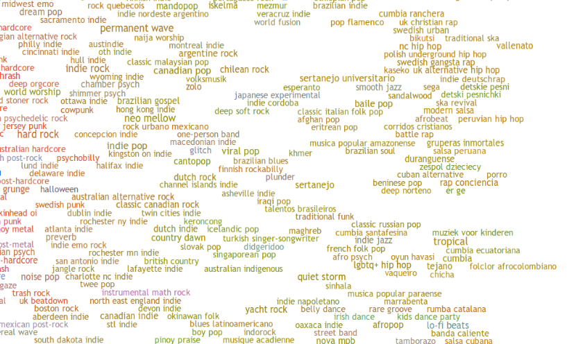 Based on the observed genre-distribution in the data, and as a result of clustering sub-genres (such as soft-rock) into parent genres (such as rock), the genres finally are chosen for annotating the clusters are: