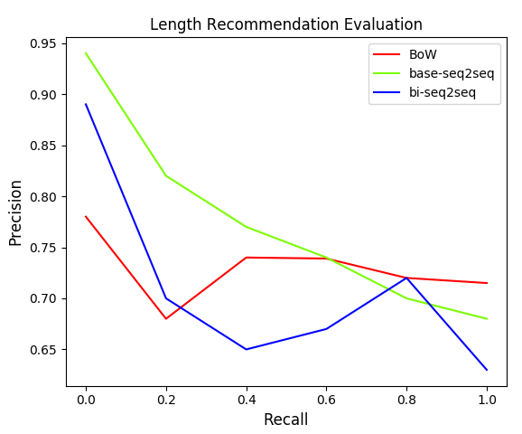 The Recommendation task, as shown in Figure below, captures some interesting insights about the effectiveness of different models for capturing different characteristics. Firstly, high precision values demonstrate the relevance of the playlist embedding space which is the first and foremost expectation from a recommendation system. Also, BoW models capture genre information better than seq2seq models, while length information is better captured by the seq2seq models, demonstrating the suitability of different models for different tasks.
