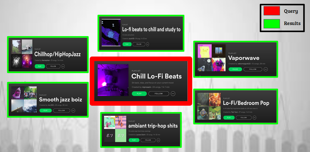 Image displaying the usage for our playlist recommendation engine. The system returns playlists most similar to the query playlist