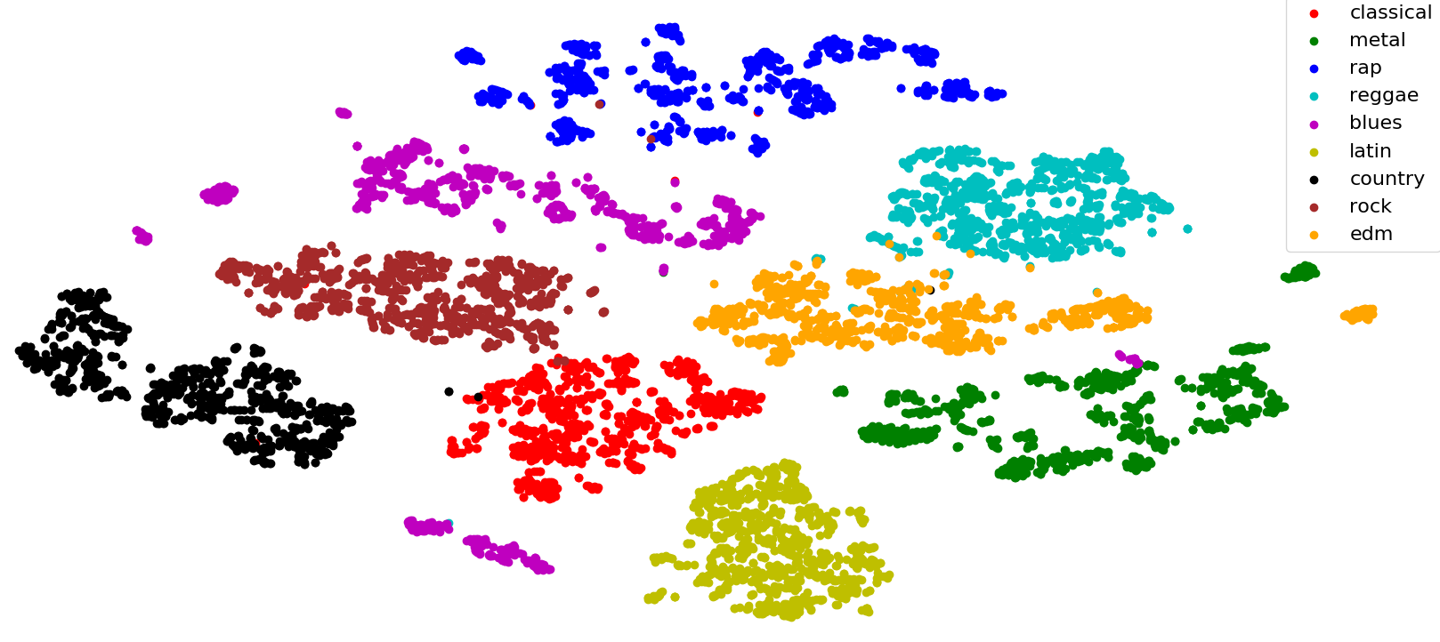 t-SNE plot for genre-annotated songs, with 1000 sampled songs for each genre